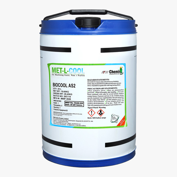 Biocool AS2 is economical and environment- friendly, long life water-soluble oil, suitable for all moderate machining and grinding operations on all ferrous and non-ferrous metals except titanium and magnesium. Formulated with refined naphthenic base oil, natural emulsifiers, corrosion inhibitor package and biocides.