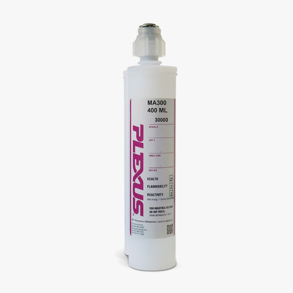 Plexus® MA300 is a two-part methacrylate adhesive designed for structural bonding of thermoplastic, metal, and composite assemblies1. Combined at a 1:1 ratio, MA300 has a working time of 3 to 6 minutes and reaches approximately 500 psi in 12 minutes and 1000 psi in 15 minutesat74°F(23°C).This product offers a combination of high strength and stiffness as well as the ability to bond a wide range of materials. PlexusMA300issuppliedinready-to-use50-mland400-mlcartridges,5-gallon(20-liter) pails, or 50-gallon(200-liter) drums to be dispensed as a non-sagging gel.